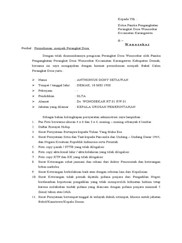 Surakarta, 7 juni 2016 kepada yth. Contoh surat lamaran kerja yang baik dan benar. Seperti kita ketahui bahwa di hotel ada berbagai macam posisi pekerjaan yang bisa disediakan, seperti bagian kitchen, waiter, receptionist, housekeeping, room boy, front office, f&b service, dan posisi lainnya. Surat permohonan menjadi perangkat desa) anda mungkin bertanya, apakah saya diperbolehkan menyalin artikel surat lamaran kerja perangkat desa ini di blog demikian ulasan tentang contoh surat lamaran perangkat desa 2020. Jadi seperti apa struktur dari sebuah surat.