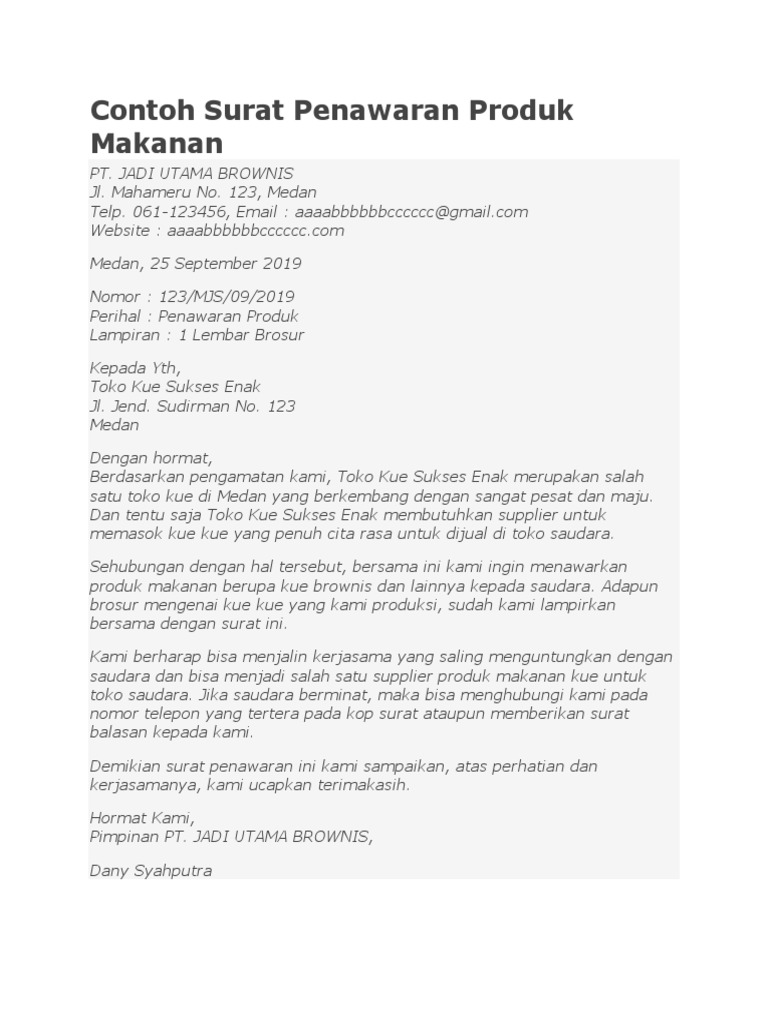 Pt adidaya putra ruko veteran, jl. Jasa catering produk makanan dan jasa konveksi. Berikut adalah contoh surat penawaran yang baik dan benar, antara lain: Semoga berguna dan bermanfaat, jangan lupa untuk membaca artikel lainnya di web ini. Sidoarjo, 10 desember 2019 hal : Contoh surat penawaran catering makanan. Surat penawaran sendiri adalah surat yang william volt. Semoga bapak/ibu berkenan menjadikan kami salah satu partner anda. 4 contoh surat penawaran kesehatan alat kantor elektronik dan. √ 10+ contoh surat penawaran | barang, jasa, kerjasama, harga, produk dll. Jika perlu negosiasi terkait harga dan metode pembelian, kami juga siap. Contoh surat penawaran harga barang kerjasama makanan produk. Surat diatas merupakan contoh surat penawaran kerjasama yang dikirimkan oleh pt.