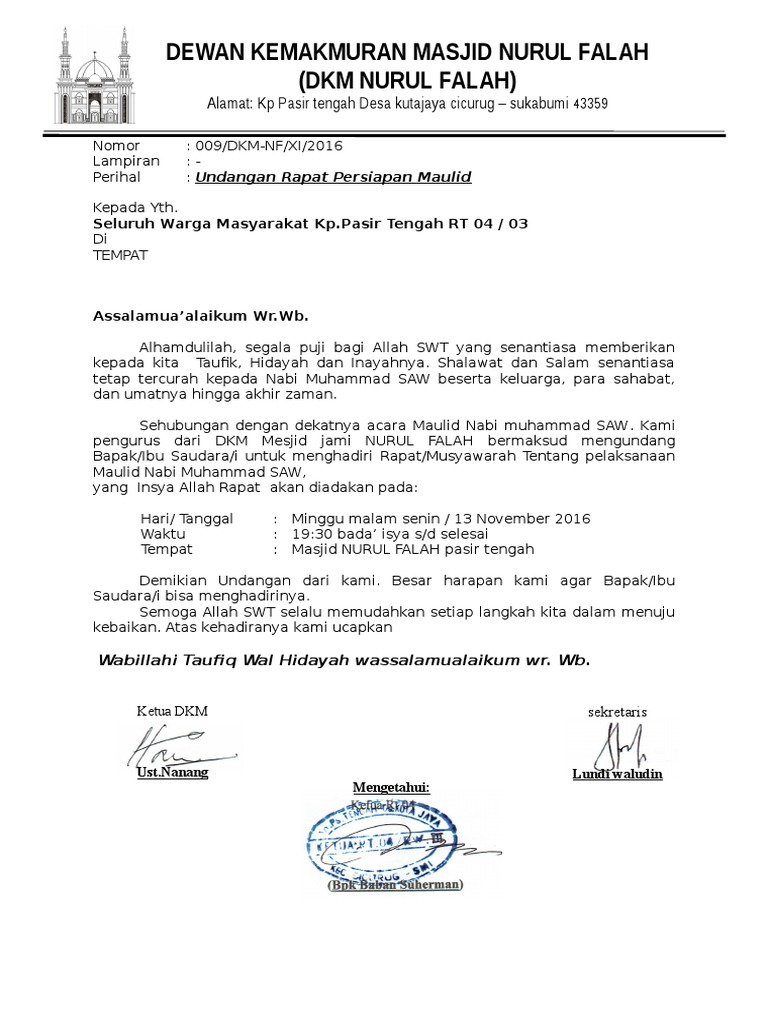 Contoh Surat Undangan Rapat Masjid / Surat Undangan Dkm Cute766 - Contoh surat undangan rapat dinas kesehatan.. Surat undangan rapat biasanya dikeluarkan saat akan diadakanya rapat penting terkait organisasi atau juga kelembagaan guna mengundang beberapa pikah agar menghadiri atau sekedar tahu tentang rapat tersebut. Panduan lengkap disertai contoh surat undangan rapat umum pemegang saham. Lalu apa yang kamu lakukan agar orang. Contoh surat undangan rapat warga dilingkup rt dan rw. Yang dimaksud dengan surat undangan tidak resmi ialah surat tersebut dibuat oleh perorangan dengan mengajak ada beberapa contoh surat undangan yang tidak resmi seperti surat undangan syukuran kelahiran.